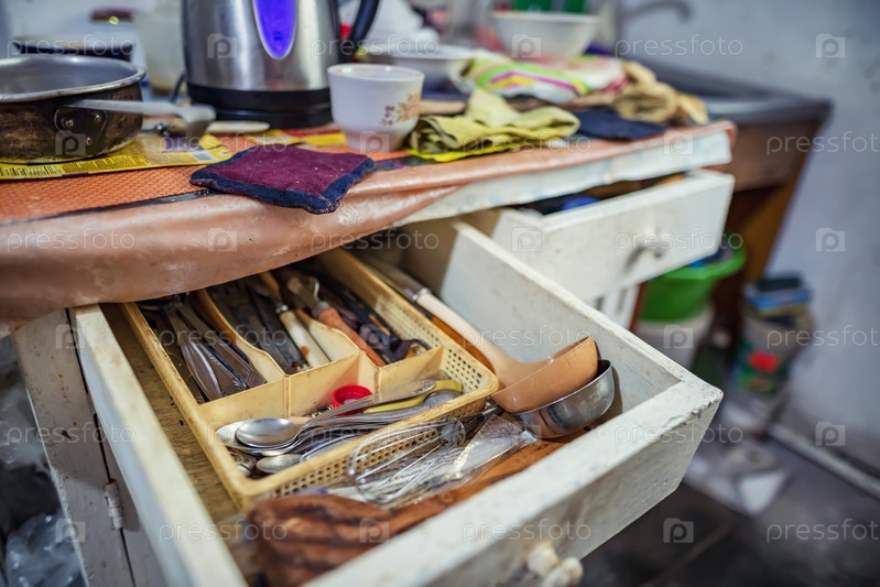 Металлические ложки и вилки в ящике старого кухонного стола