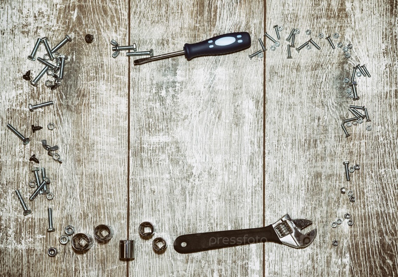 Макет мужских карточек с пустым местом для текста на деревянном фоне и рамкой из инструментов