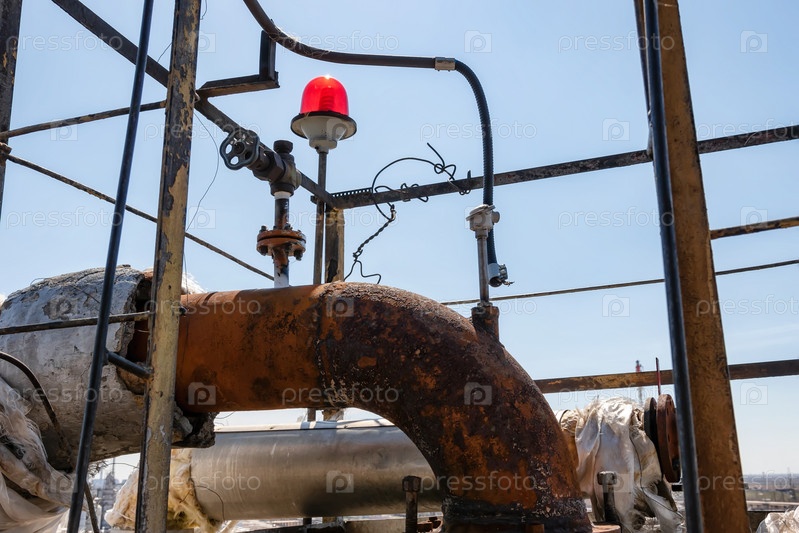 Старые ржавые технологические трубопроводы на нефтеперерабатывающем заводе