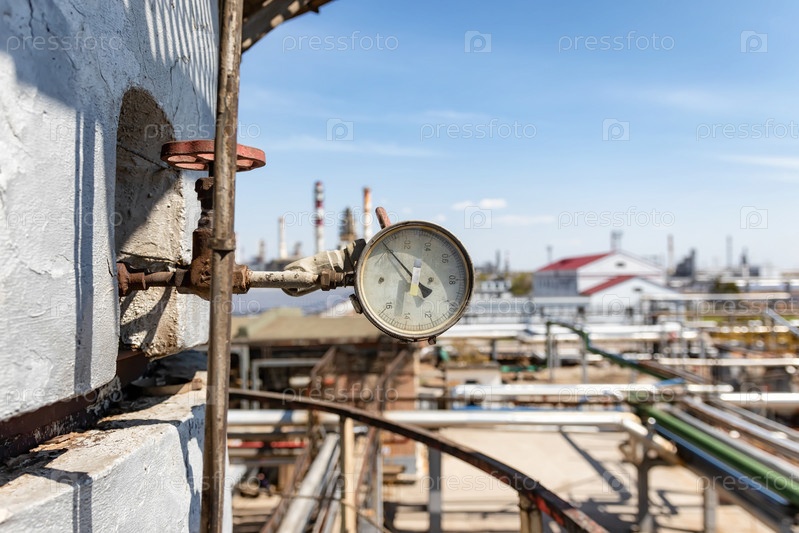 Правильно работающий манометр, установленный на трубопроводе на старом химическом заводе