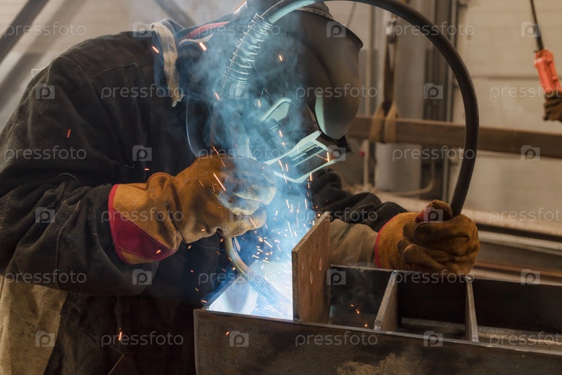 Сварщик выполняет сварочные работы металлоконструкций