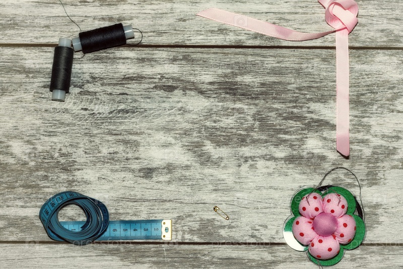 Пуговицы, лента, нитки и иглы для шитья