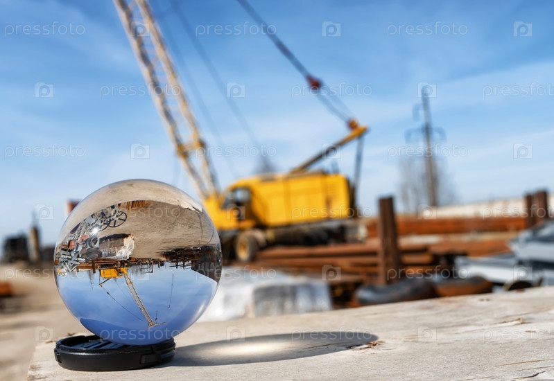 Вид на базу строительных материалов с помощью большого крана через шар с оптическими линзами