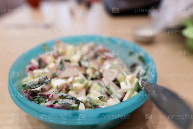 Салат из свежих овощей со сметаной в пластиковой тарелке