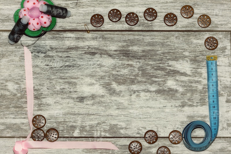 Пуговицы, лента, нитки и иглы для шитья