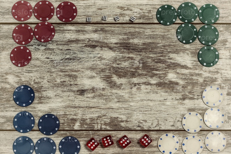 Казино игральные фишки и кости на светлом деревянном фоне выложены по краям с возможностью сделать надпись в центре