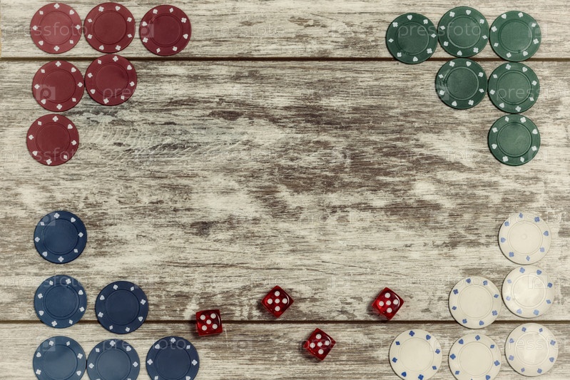Казино игральные фишки и кости на светлом деревянном фоне выложены по краям с возможностью сделать надпись в центре