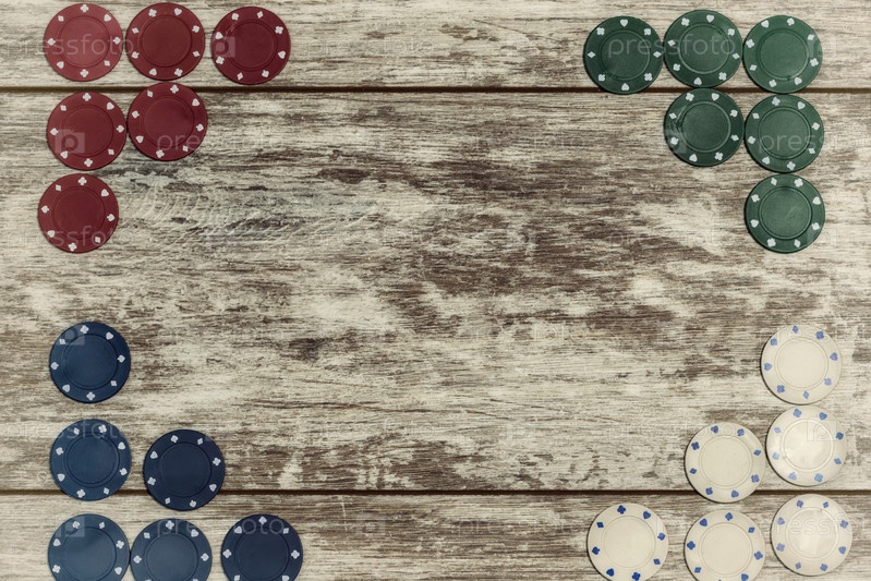 Фишки казино на светлом деревянном фоне выложены по краям с возможностью сделать надпись по центру