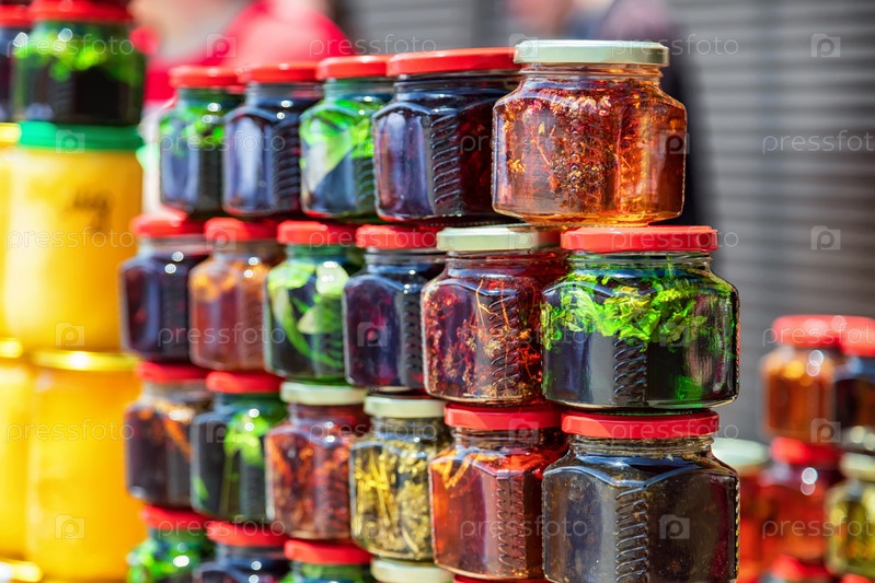Маленькие красочные стеклянные баночки с вареньем из местных ягод, трав, кореньев и орехов