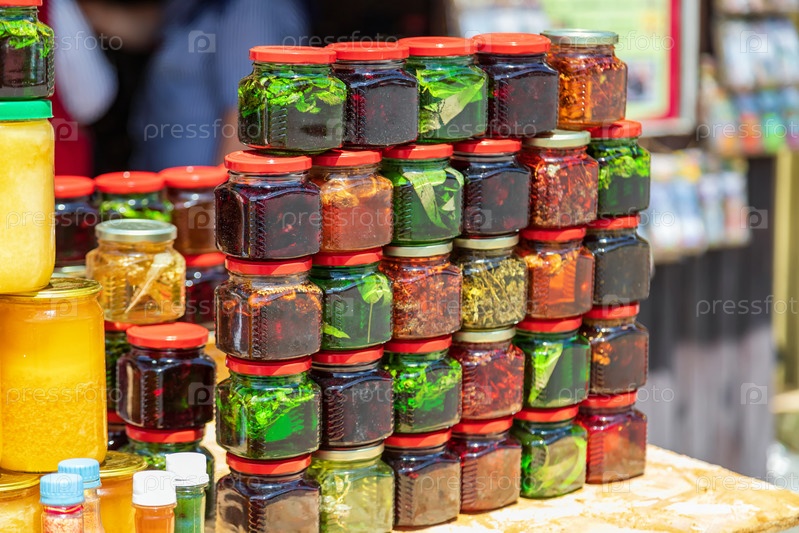 Маленькие красочные стеклянные баночки с вареньем из местных ягод, трав, кореньев и орехов