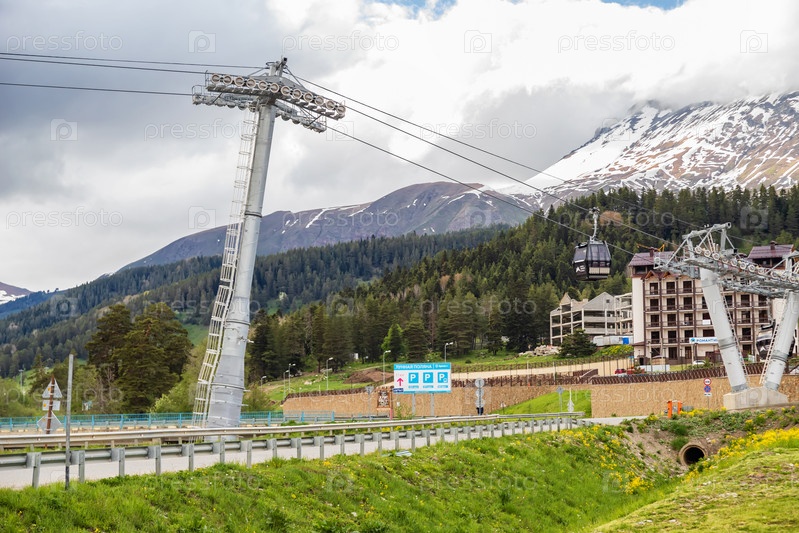 Пустой горнолыжный курорт летом с канатной дорогой и отелями