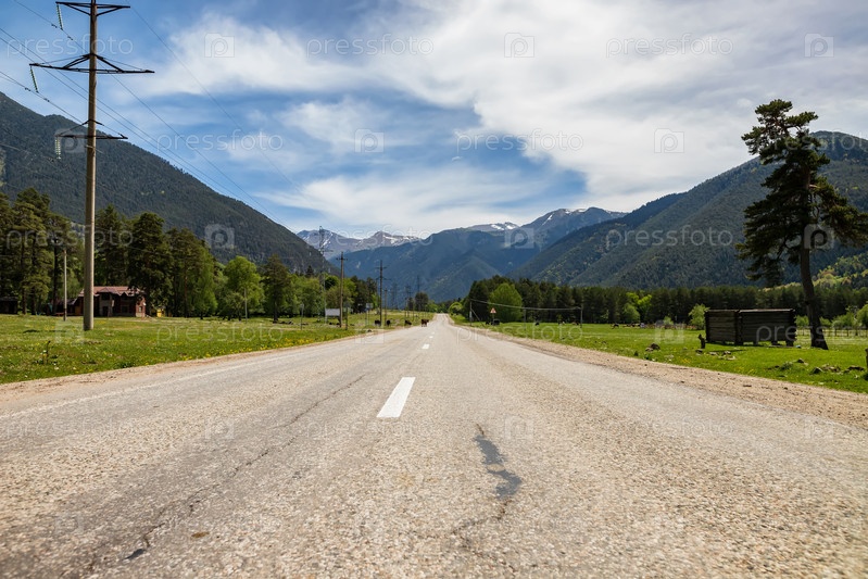 Старая асфальтовая дорога уходит на фоне больших гор