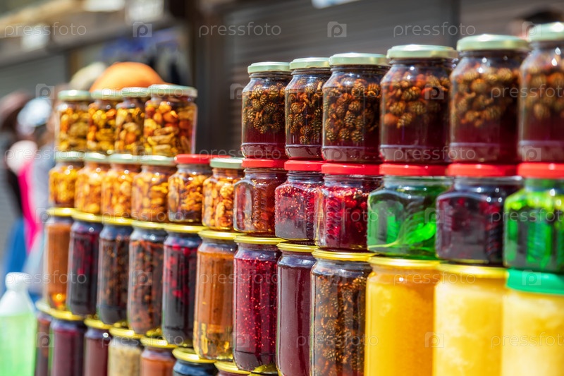 Маленькие красочные стеклянные баночки с вареньем из местных ягод, трав, кореньев и орехов