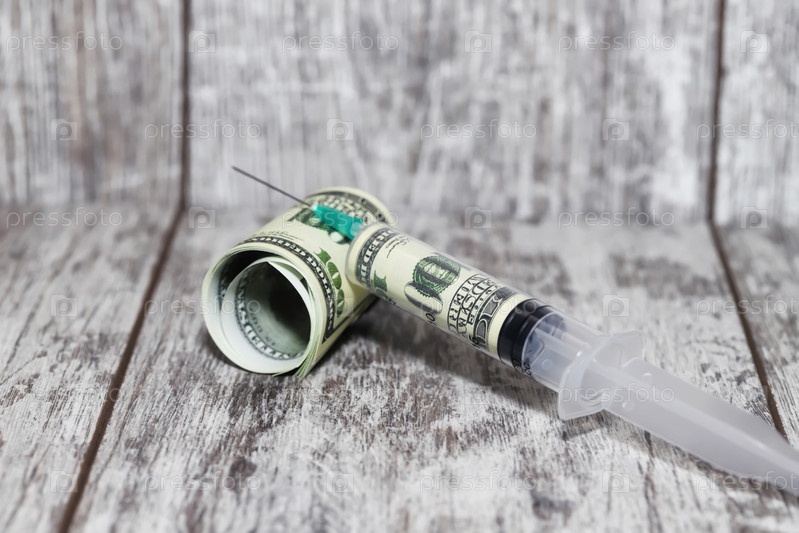 Инъекционный шприц долларовой смеси на деревянном фоне