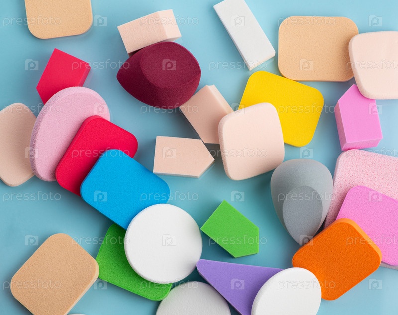 Куча красочных косметических губок на синем фоне. Вид сверху