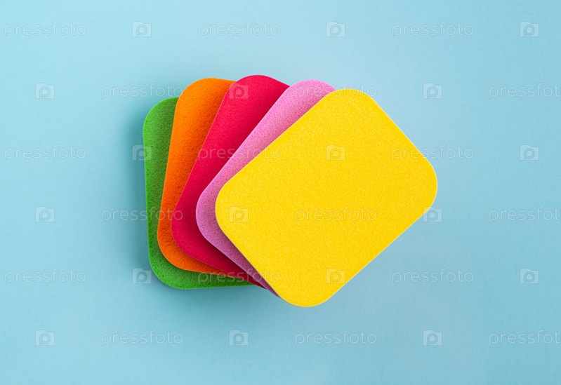 Куча красочных косметических губок на синем фоне. Вид сверху