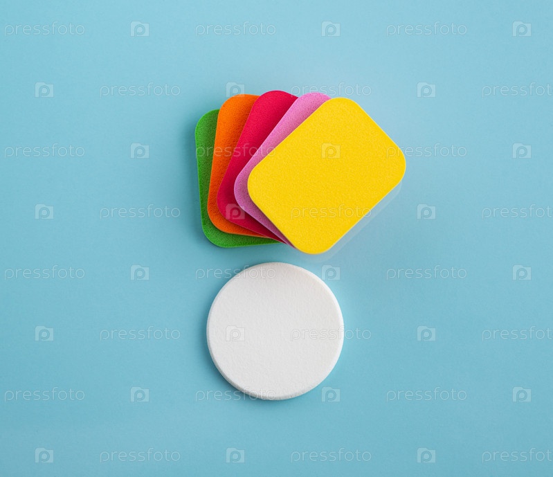 Куча красочных косметических губок на синем фоне. Вид сверху