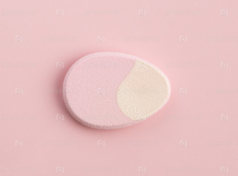 Косметическая губка в форме яйца на розовом фоне. Вид сверху