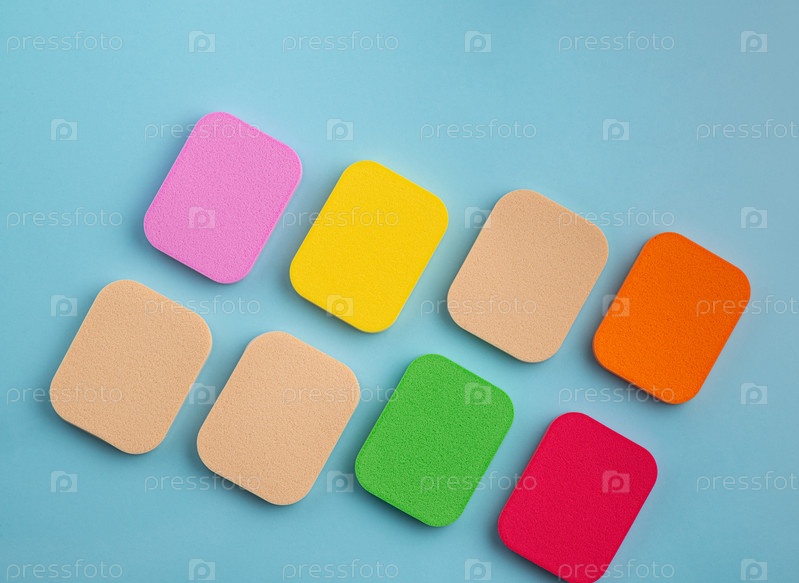 Куча красочных косметических губок на синем фоне. Вид сверху