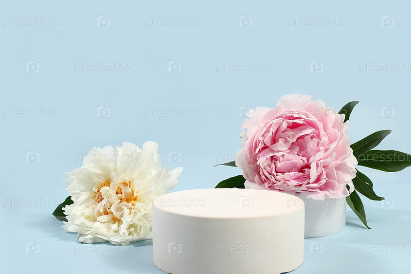 Минимальная цветочная композиция. Абстрактный фон с пустым подиумом и цветами пионов, пустая витрина для демонстрации или презентации косметических продуктов, открытка с местом для текста, выборочный фокус