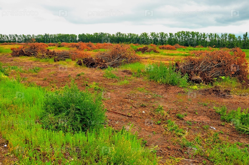 Деревья корчуют восстанавливая посевные площади среди посадок