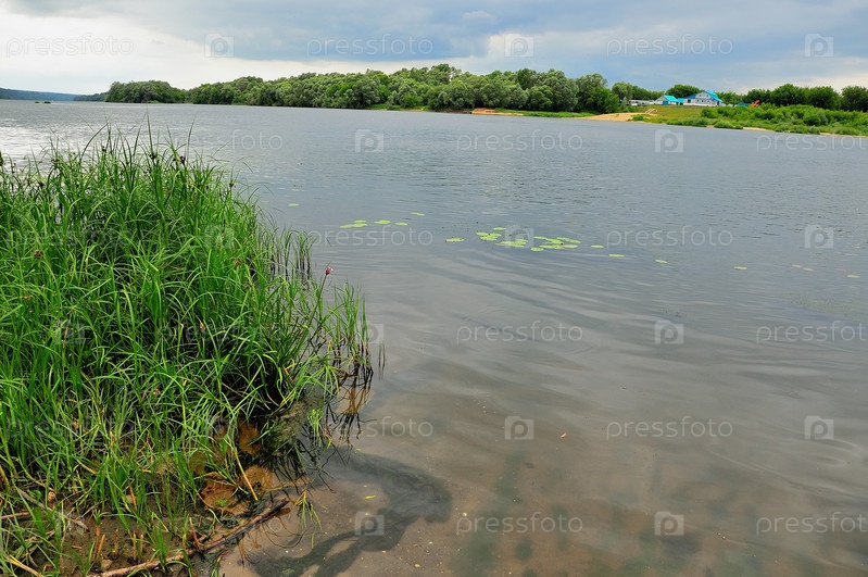 Река Ока с береговой и водной растительностью с видом на противоположный берег под хмурым небом