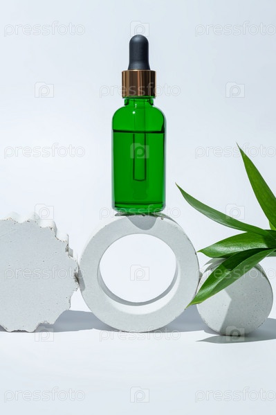 Зеленая стеклянная косметическая бутылка с капельницей на белом фоне с круглым лепестком и тропическими листьями. Концепция натуральной косметики, натуральные эфирные масла и средства по уходу за кожей