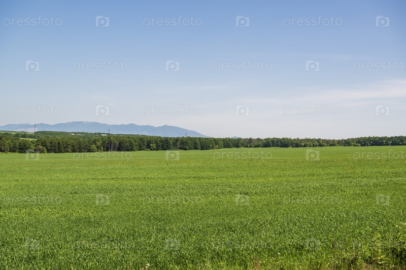 Сельскохозяйственное поле с зеленой травой и голубым небом на заднем плане