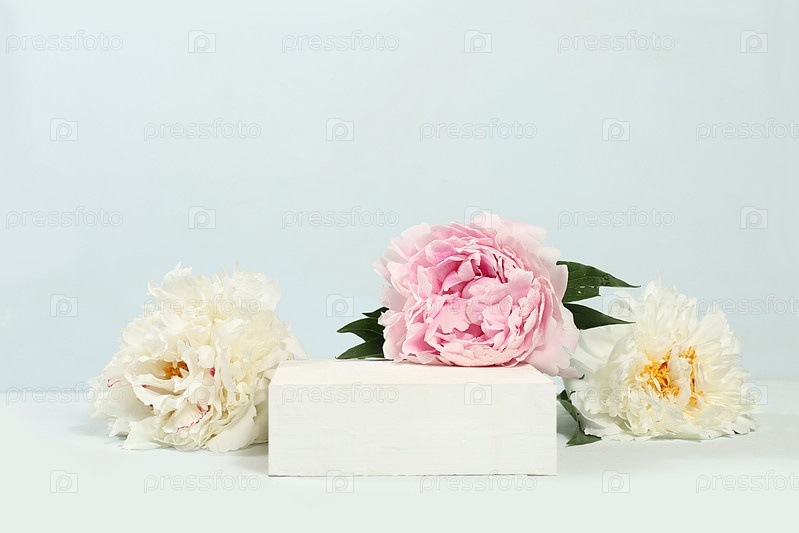 Абстрактный фон с натуральным деревянным подиумом и цветами пионов, пустая витрина для демонстрации или презентации косметических продуктов, минимальная цветочная композиция, избирательный фокус