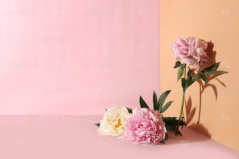 Абстрактный фон с цветами пиона и резкими тенями. Минимальная цветочная композиция, пустая витрина для демонстрации или презентации косметических продуктов, открытка с местом для текста, выборочный фокус. романтический стиль