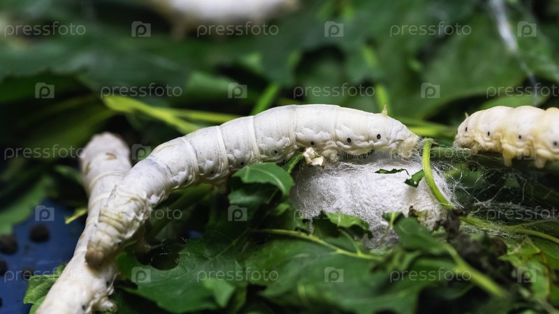 Шелкопряд, гусеница на листьях, крупный план