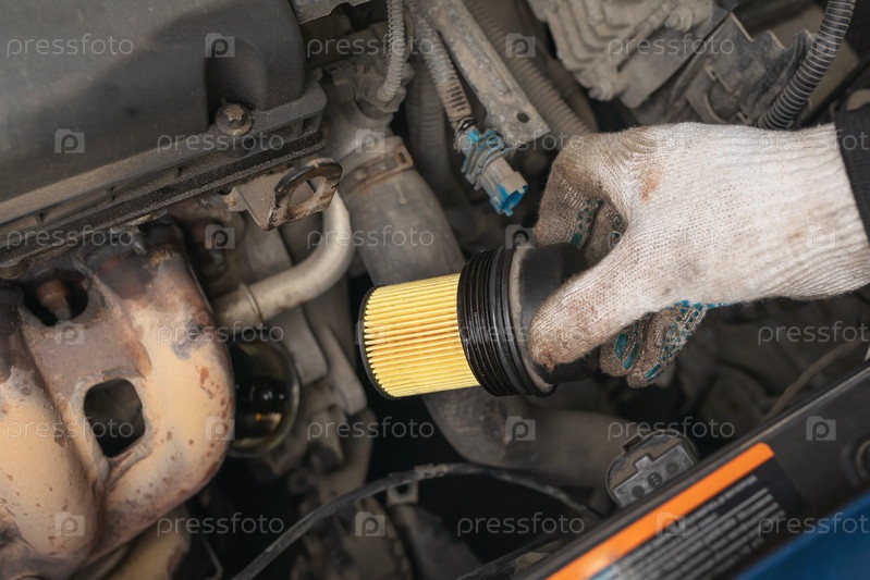 Автомеханик занимается сервисным обслуживанием легкового автомобиля, устанавливая новый масляный фильтр двигателя