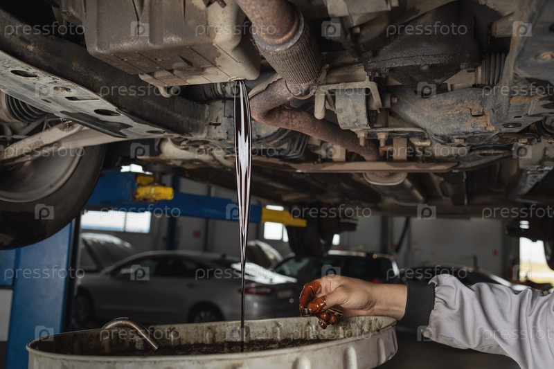 Автомеханик сливает старое отработанное моторное масло на СТО, плановое сервисное обслуживание легкового автомобиля