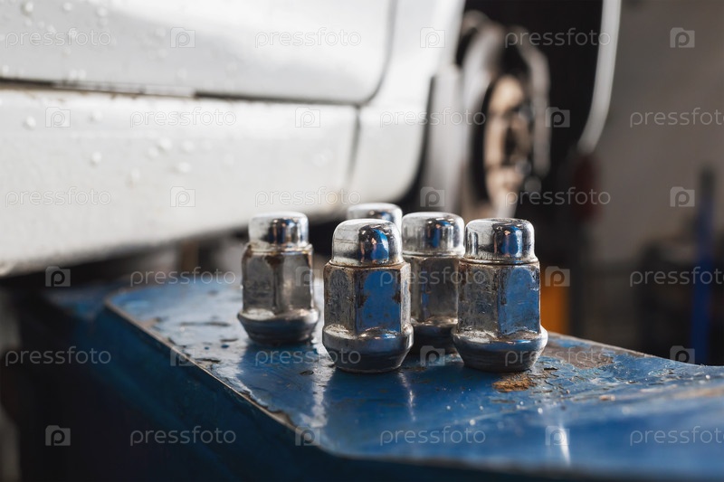 Болты для автомобильных колес лежащие в одном месте на ножке подъемника после снятия колеса в автосервисе