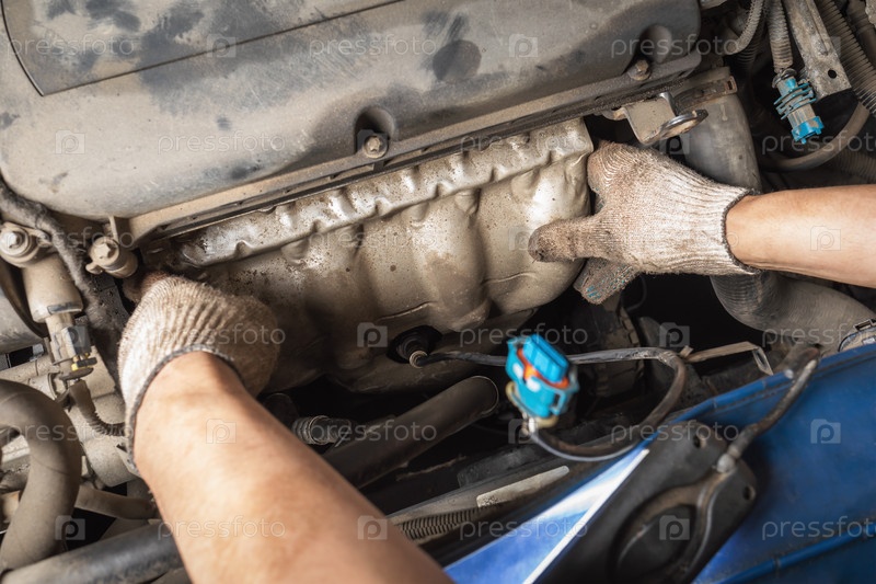 Процесс установки защиты коллектора на двигатель автомобиля, сотрудник автосервиса за работой