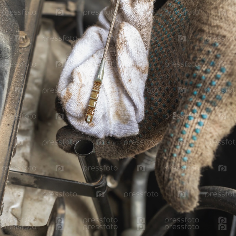 Мужчина проверяет уровень масла в двигателе автомобиля после его замены, крупным планом