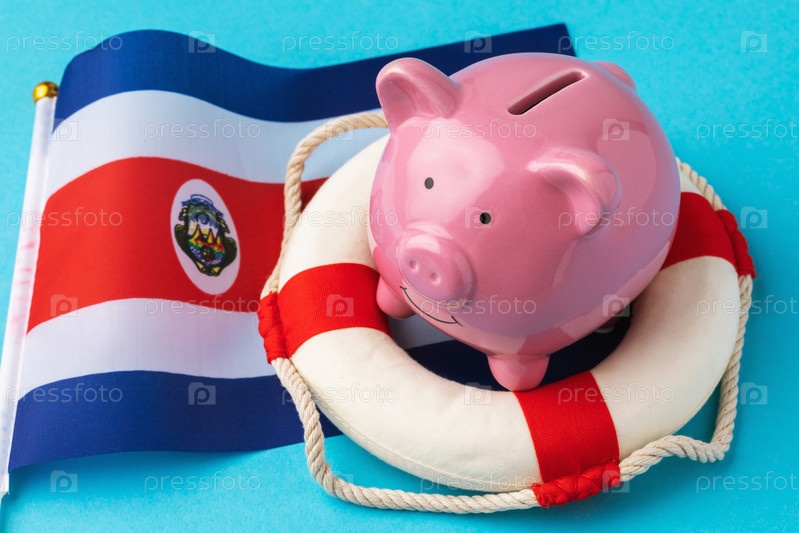 Копилка, спасательный круг и флаг на синем фоне, концепция на тему спасения экономики Коста-Рики