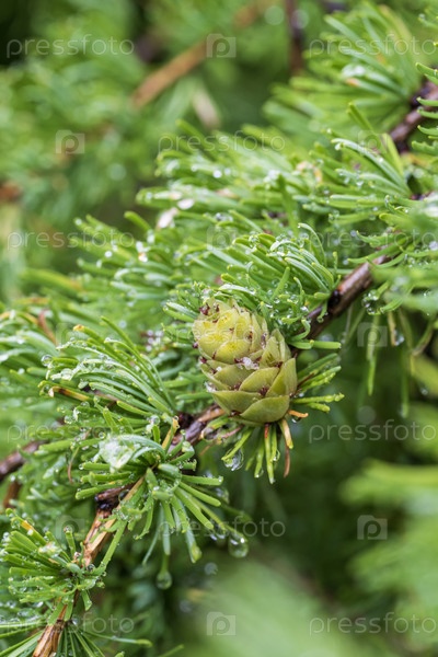 Зеленая ветка лиственницы с молодыми шишками и каплями дождя