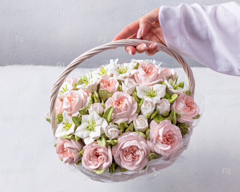 Зефирный букет цветов в подарочной коробке на светлом фоне