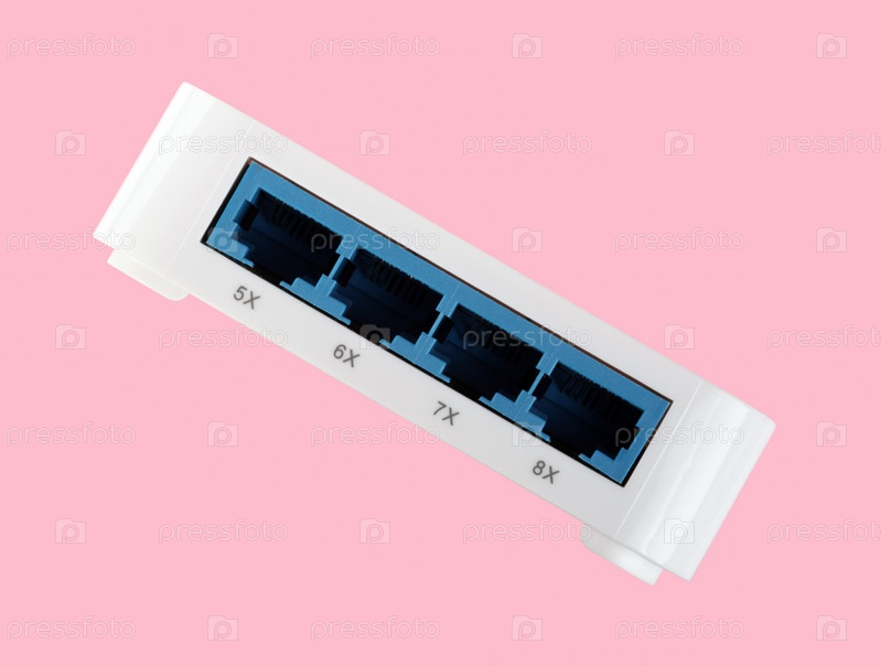 Белый 8-портный пластиковый коммутатор Ethernet изолирован на розовом фоне в сухой день