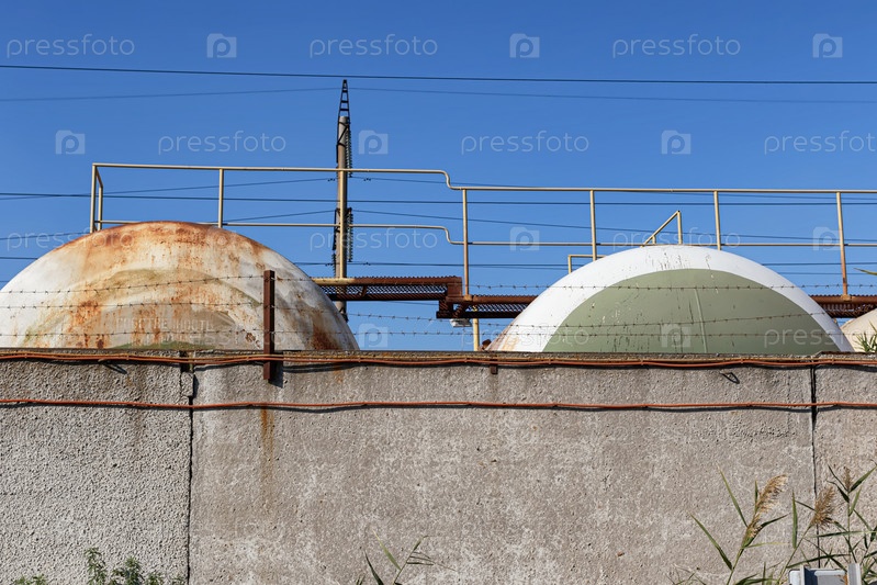 Два резервуара для хранения нефтепродуктов за бетонным забором