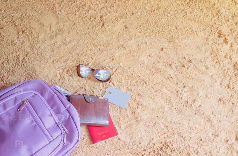 Рюкзак, паспорт, кошелек, кредитная карта и солнцезащитные очки на песчаном пляже. Концепция пляжного отдыха