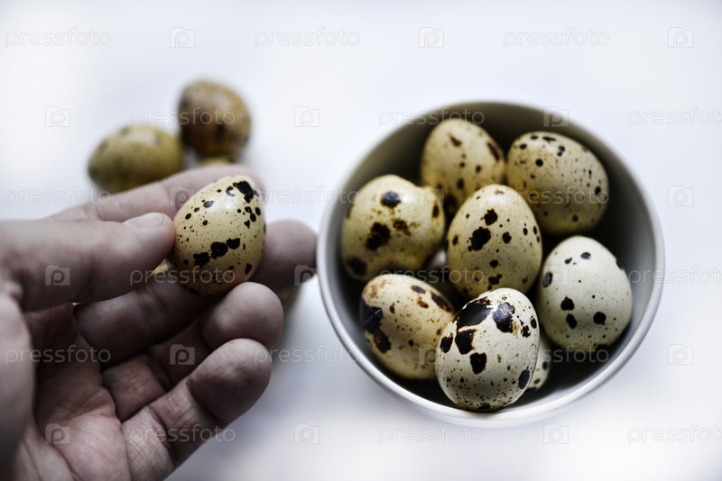 Перепелиные яйца в руке. Пищевые яйца на белом фоне