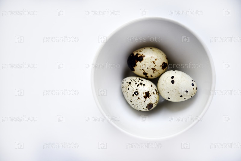 Перепелиные яйца в белой тарелке. Пищевые яйца на белом фоне