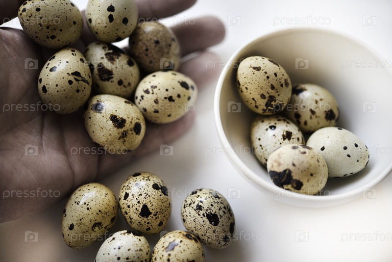 Перепелиные яйца в руке. Пищевые яйца на белом фоне