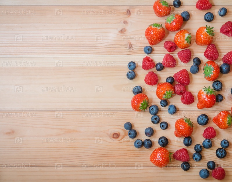 Клубника, черника и малина в качестве границы на деревянном фоне