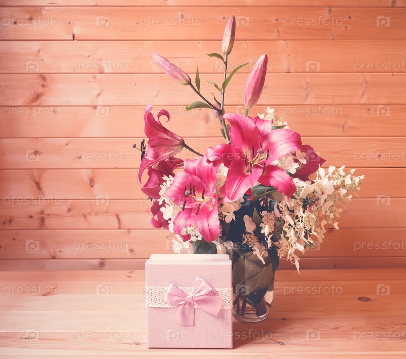 Фиолетовые лилии и белые цветы гортензии и фиолетовая подарочная коробка. Выборочный фокус. Тонированное изображение
