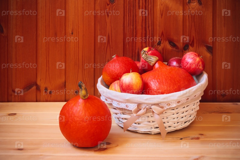 Тыквы и яблоки в плетеной корзине на деревянном столе. Выборочный фокус