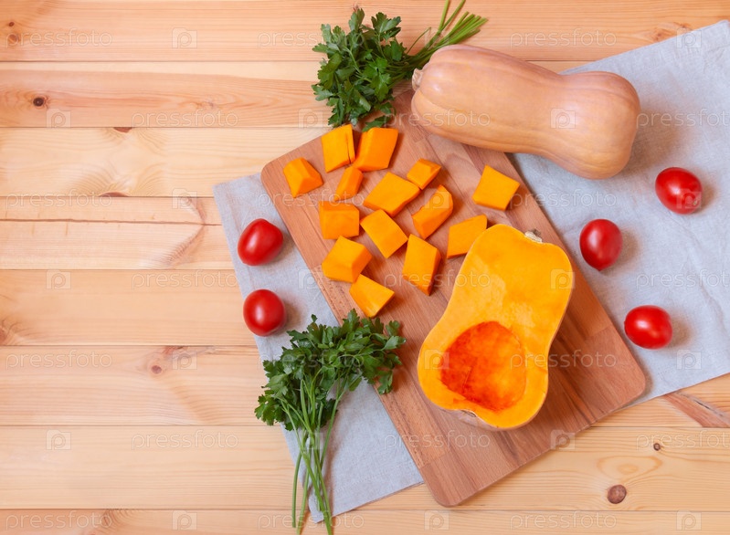 Мускатная тыква, кусочки тыквы, свежая петрушка и помидоры на деревянном столе. Вид сверху, пространство для копирования