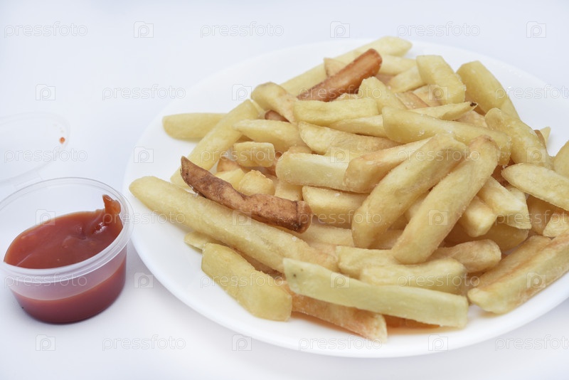 Картофель фри на белой тарелке и соусе. Вкусный завтрак из жареного картофеля